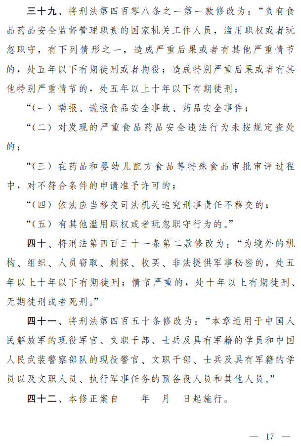 從二次審議稿內(nèi)容來看, 關于食品藥品監(jiān)管瀆職罪的規(guī)定與今年7月份的發(fā)布的草案相比 ,有了重大變化,取消了“未及時發(fā)現(xiàn)監(jiān)督管理區(qū)域內(nèi)重大食品藥品安全隱患的“的規(guī)定。草案內(nèi)容具體如下: