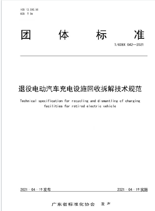 2021年4月19日,廣東省標(biāo)準(zhǔn)化協(xié)會(huì)發(fā)布團(tuán)體標(biāo)準(zhǔn)《退役電動(dòng)汽車充電設(shè)施回收拆解技術(shù)規(guī)范》,為日漸增多的電動(dòng)汽車充電設(shè)施的回收拆解提供技術(shù)支撐。