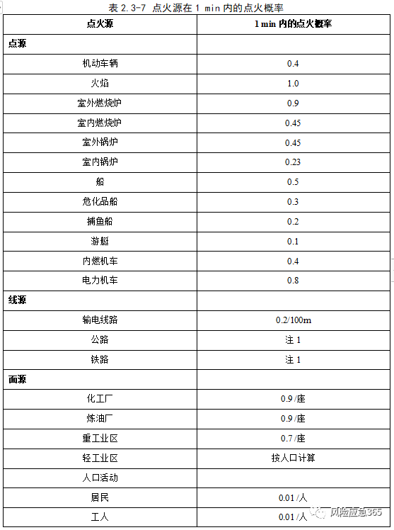 根據(jù)《危險(xiǎn)化學(xué)品生產(chǎn)裝置和儲(chǔ)存設(shè)施外部安全防護(hù)距離確定方法》(GB/T 37243-2019),典型點(diǎn)火源分為:a)點(diǎn)源,如加熱爐(鍋爐)、機(jī)車(chē)、火炬、人員;根據(jù)化工園區(qū)情況,點(diǎn)火源主要為人員靜電、違章動(dòng)火、電氣設(shè)施、雷擊、機(jī)動(dòng)車(chē)輛、使用工具(鐵質(zhì))不當(dāng)產(chǎn)生火花以及外來(lái)火源等。根據(jù)《化工企業(yè)定量風(fēng)險(xiǎn)評(píng)價(jià)導(dǎo)則》(AQ/T 3046-2013)附錄G,立即點(diǎn)火概率與裝置類(lèi)型、物質(zhì)種類(lèi)及泄漏(釋放)有關(guān),固定裝置可燃物質(zhì)泄漏后,立即點(diǎn)火概率見(jiàn)下表。延遲點(diǎn)火的點(diǎn)火概率應(yīng)考慮點(diǎn)火源特性、泄漏組分以及點(diǎn)火源處于蒸氣云團(tuán)內(nèi)的概率,不同點(diǎn)火源在1min內(nèi)的點(diǎn)火概率見(jiàn)下表。