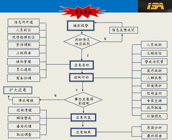 應(yīng)急反應(yīng)的流程一般按照下面執(zhí)行,但是應(yīng)急反應(yīng)講究的快速反應(yīng),前提是確保安全的條件下進(jìn)行處置。