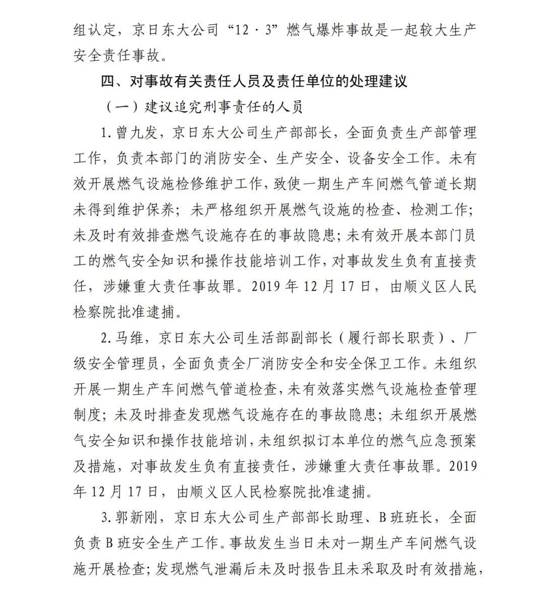 2.馬維,京日東大公司生活部副部長(zhǎng)(履行部長(zhǎng)職責(zé))、廠級(jí)安全管理員,全面負(fù)責(zé)全廠消防安全和安全保衛(wèi)工作。未組織開展一期生產(chǎn)車間燃?xì)夤艿罊z查,未有效落實(shí)燃?xì)庠O(shè)施檢查管理制度;未及時(shí)排查發(fā)現(xiàn)燃?xì)庠O(shè)施存在的事故隱患;未組織開展燃?xì)獍踩R(shí)和操作技能培訓(xùn),未組織擬訂本單位的燃?xì)鈶?yīng)急預(yù)案及措施,對(duì)事故發(fā)生負(fù)有直接責(zé)任,涉嫌重大責(zé)任事故罪。2019 年 12 月 17 日,由順義區(qū)人民檢察院批準(zhǔn)逮捕。