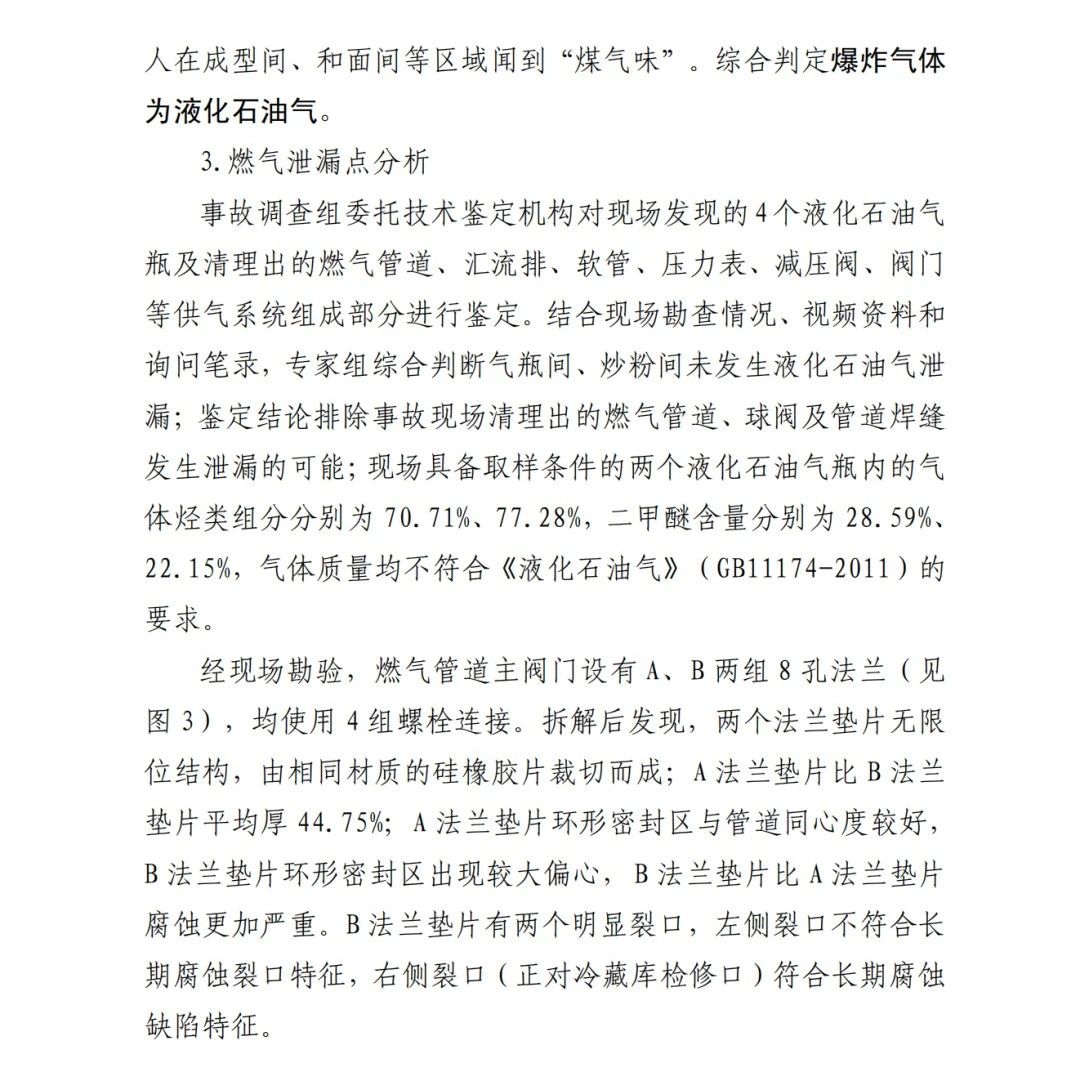 本次事故的直接原因?yàn)椋?/span>京日東大公司一期生產(chǎn)車間燃?xì)夤艿乐鏖y門A、B法蘭墊片為甲基乙烯基硅橡膠材質(zhì),受管道內(nèi)液化石油氣和二甲醚混合氣體長(zhǎng)期腐蝕,墊片物理機(jī)械性能下降,發(fā)育出微小裂隙并逐漸增長(zhǎng),局部發(fā)生破損脫落;在管道內(nèi)部壓力作用下,B墊片發(fā)生撕裂并形成泄漏口,泄漏出的氣體與空氣混合,在冷藏庫(kù)內(nèi)外空間形成爆炸性混合氣體,遇電氣火花等點(diǎn)火源發(fā)生爆炸,并引燃現(xiàn)場(chǎng)可燃物,導(dǎo)致事故發(fā)生。
