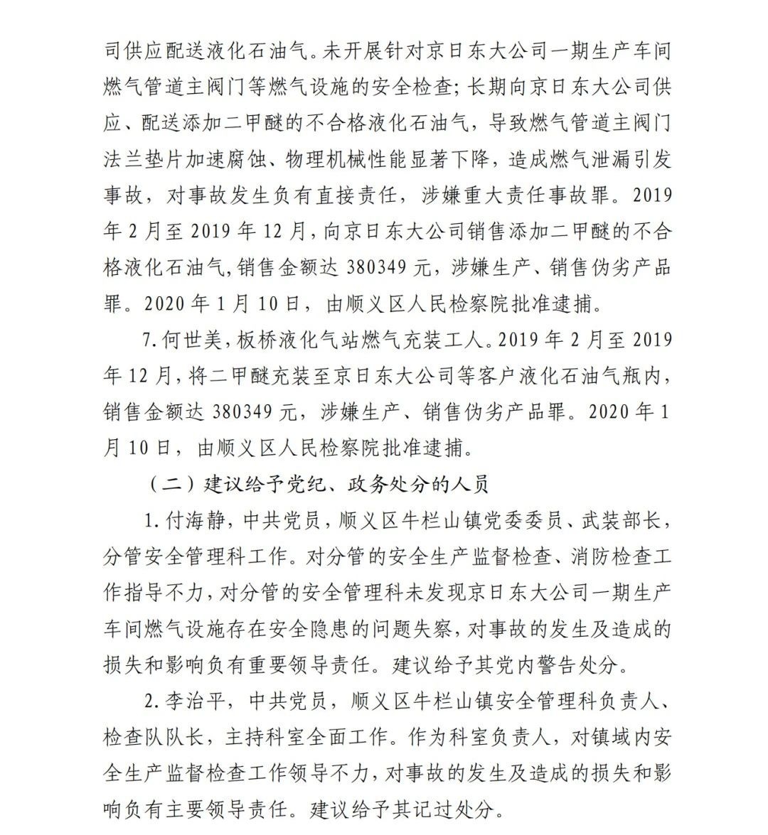 6.吳建新,板橋液化氣站工作人員,具體負(fù)責(zé)向京日東大公15司供應(yīng)配送液化石油氣。未開展針對(duì)京日東大公司一期生產(chǎn)車間燃?xì)夤艿乐鏖y門等燃?xì)庠O(shè)施的安全檢查;長(zhǎng)期向京日東大公司供應(yīng)、配送添加二甲醚的不合格液化石油氣,導(dǎo)致燃?xì)夤艿乐鏖y門法蘭墊片加速腐蝕、物理機(jī)械性能顯著下降,造成燃?xì)庑孤┮l(fā) 事故,對(duì)事故發(fā)生負(fù)有直接責(zé)任,涉嫌重大責(zé)任事故罪。2019 年 2 月至 2019 年 12 月,向京日東大公司銷售添加二甲醚的不合 格液化石油氣,銷售金額達(dá) 380349 元,涉嫌生產(chǎn)、銷售偽劣產(chǎn)品 罪。2020 年 1 月 10 日,由順義區(qū)人民檢察院批準(zhǔn)逮捕。
