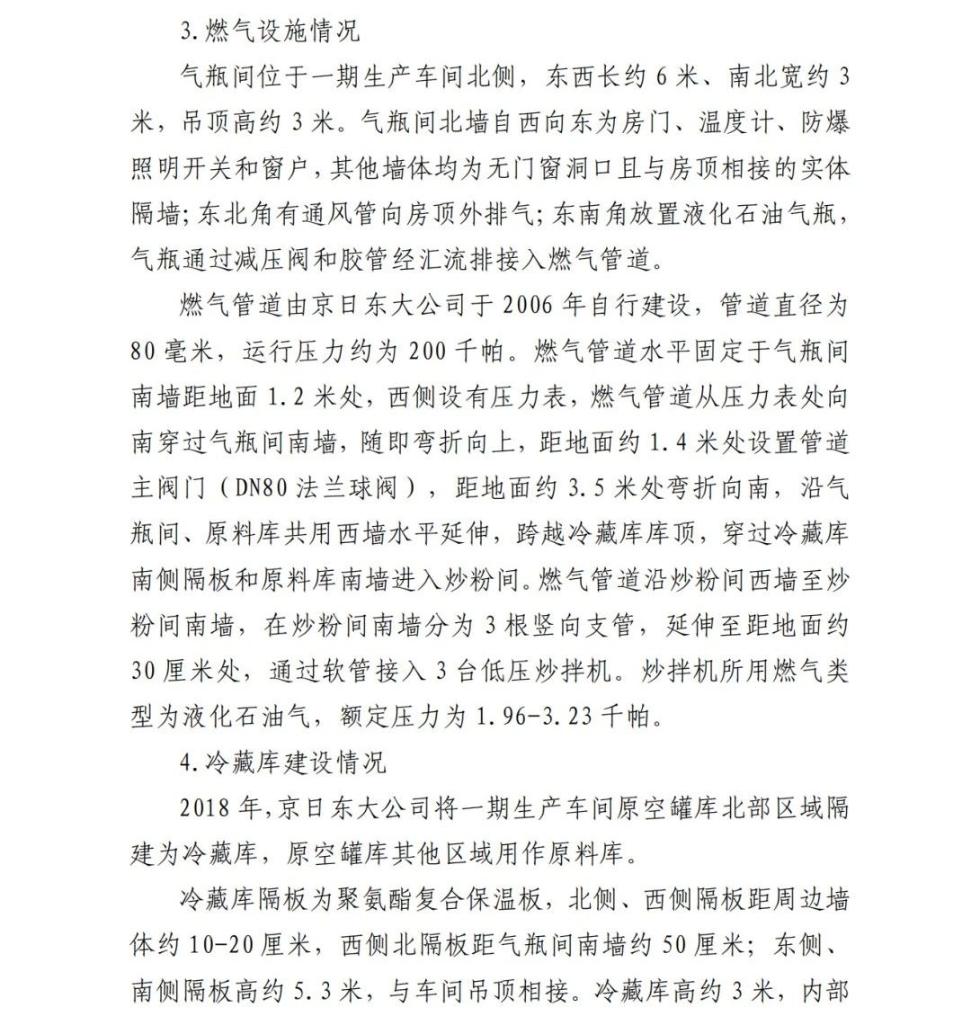 事故調(diào)查報(bào)告顯示:方勇忠2006年負(fù)責(zé)京日東大公司一期生產(chǎn)車間建設(shè)工作,期間未委托具有相應(yīng)資質(zhì)的施工單位,而組織本單位人員自行建設(shè)安裝燃?xì)庠O(shè)施,導(dǎo)致燃?xì)庠O(shè)施安全隱患長(zhǎng)期存在。另外,方勇忠2018年負(fù)責(zé)一期生產(chǎn)車間內(nèi)新建冷藏庫(kù)建設(shè),將部分管道、閥門等燃?xì)庠O(shè)施封閉在通風(fēng)不良的場(chǎng)所內(nèi),且未設(shè)置通風(fēng)、燃?xì)庑孤﹫?bào)警等安全設(shè)施,因而對(duì)事故發(fā)生負(fù)有直接責(zé)任。