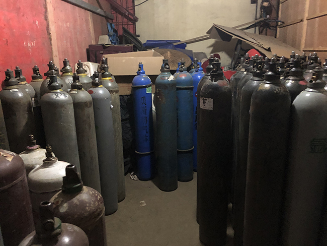 浙江杭州市案例:2021年3月8日上午,浙江省杭州市蕭山區(qū)應(yīng)急管理局執(zhí)法人員對某公司進行執(zhí)法檢查。期間,執(zhí)法人員發(fā)現(xiàn)廠區(qū)內(nèi)一簡易鋼棚搭設(shè)的倉庫,玻璃窗均被物體人為遮擋,檢查發(fā)現(xiàn)倉庫內(nèi)堆放了大量?;?,包括滿瓶二氧化碳、氧氣、乙炔、混合氣體、氮氣等176個氣瓶。同時,該倉庫緊鄰公司員工宿舍樓搭設(shè),宿舍樓里還住著數(shù)十個工人,一旦發(fā)生爆炸,后果不堪設(shè)想。