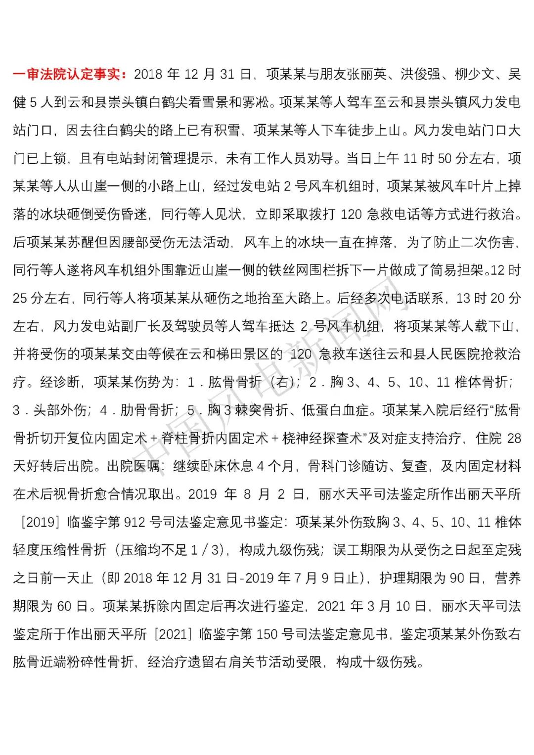 法院認(rèn)定事實(shí):2018年12月31日,項(xiàng)建英與朋友張麗英、洪俊強(qiáng)、柳少文、吳健5人到云和縣崇頭鎮(zhèn)白鶴尖看雪景和霧凇。項(xiàng)建英等人駕車至云和縣崇頭鎮(zhèn)風(fēng)力發(fā)電站門口,因去往白鶴尖的路上已有積雪,項(xiàng)建英等人下車徒步上山。風(fēng)力發(fā)電站門口大門已上鎖,且有電站封閉管理提示,未有工作人員勸導(dǎo)。當(dāng)日上午11時(shí)50分左右,項(xiàng)建英等人從山崖一側(cè)的小路上山,經(jīng)過發(fā)電站2號風(fēng)車機(jī)組時(shí),項(xiàng)建英被風(fēng)車葉片上掉落的冰塊砸倒受傷昏迷,同行等人見狀,立即采取撥打120急救電話等方式進(jìn)行救治。后項(xiàng)建英蘇醒但因腰部受傷無法活動(dòng),風(fēng)車上的冰塊一直在掉落,為了防止二次傷害,同行等人遂將風(fēng)車機(jī)組外圍靠近山崖一側(cè)的鐵絲網(wǎng)圍欄拆下一片做成了簡易擔(dān)架。12時(shí)25分左右,同行等人將項(xiàng)建英從砸傷之地抬至大路上。后經(jīng)多次電話聯(lián)系,13時(shí)20分左右,風(fēng)力發(fā)電站副廠長及駕駛員等人駕車抵達(dá)2號風(fēng)車機(jī)組,將項(xiàng)建英等人載下山,并將受傷的項(xiàng)建英交由等候在云和梯田景區(qū)的120急救車送往云和縣人民醫(yī)院搶救治療。經(jīng)診斷,項(xiàng)建英傷勢為:1.肱骨骨折(右);2.胸3、4、5、10、11椎體骨折;3.頭部外傷;4.肋骨骨折;5.胸3棘突骨折、低蛋白血癥。項(xiàng)建英入院后經(jīng)行“肱骨骨折切開復(fù)位內(nèi)固定術(shù)+脊柱骨折內(nèi)固定術(shù)+橈神經(jīng)探查術(shù)”及對癥支持治療,住院28天好轉(zhuǎn)后出院。出院醫(yī)囑:繼續(xù)臥床休息4個(gè)月,骨科門診隨訪、復(fù)查,及內(nèi)固定材料在術(shù)后視骨折愈合情況取出。2019年8月2日,麗水天平司法鑒定所作出麗天平所[2019]臨鑒字第912號司法鑒定意見書鑒定:項(xiàng)建英外傷致胸3、4、5、10、11椎體輕度壓縮性骨折(壓縮均不足1/3),構(gòu)成九級傷殘;誤工期限為從受傷之日起至定殘之日前一天止(即2018年12月31日-2019年7月9日止),護(hù)理期限為90日,營養(yǎng)期限為60日。項(xiàng)建英拆除內(nèi)固定后再次進(jìn)行鑒定,2021年3月10日,麗水天平司法鑒定所于作出麗天平所[2021]臨鑒字第150號司法鑒定意見書,鑒定項(xiàng)建英外傷致右肱骨近端粉碎性骨折,經(jīng)治療遺留右肩關(guān)節(jié)活動(dòng)受限,構(gòu)成十級傷殘。
