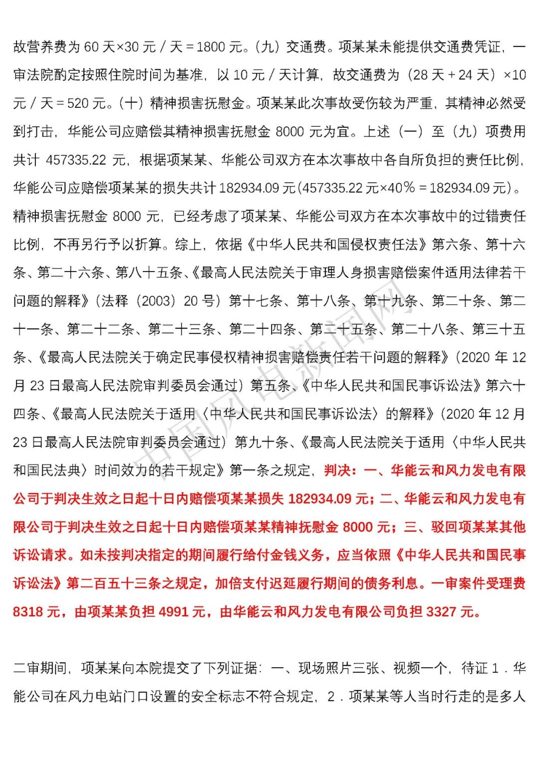法院判決:一、華能云和風(fēng)力發(fā)電有限公司于判決生效之日起十日內(nèi)賠償項(xiàng)建英損失182934.09元;二、華能云和風(fēng)力發(fā)電有限公司于判決生效之日起十日內(nèi)賠償項(xiàng)建英精神撫慰金8000元;三、駁回項(xiàng)建英其他訴訟請求。